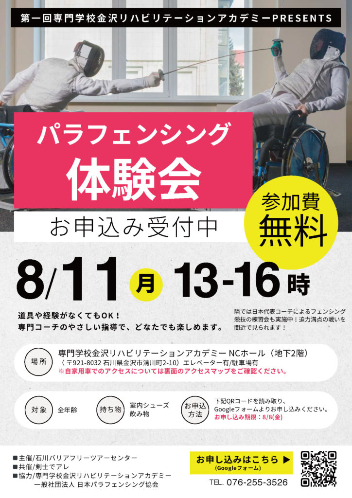 本イベントは、専門学校金沢リハビリテーションアカデミー(金沢市清川町)の全面協力のもと、 同校内のNCホールを会場として実施します。 フェンシング、パラフェンシングに興味がある方はもちろん、どなたでもご参加いただけます。